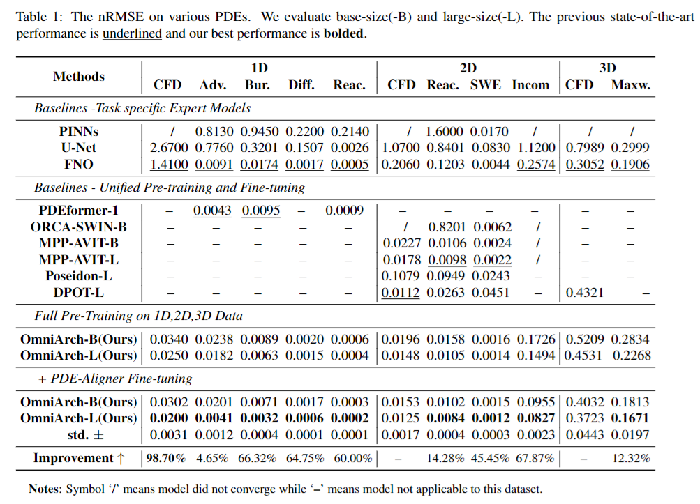 表:OmniArch在11类PDE上的nRMSE性能对比(越低越好),显著优于专用模型(上)与其他统一预训练模型(中)。下划线为之前SOTA,加粗为本文最佳。