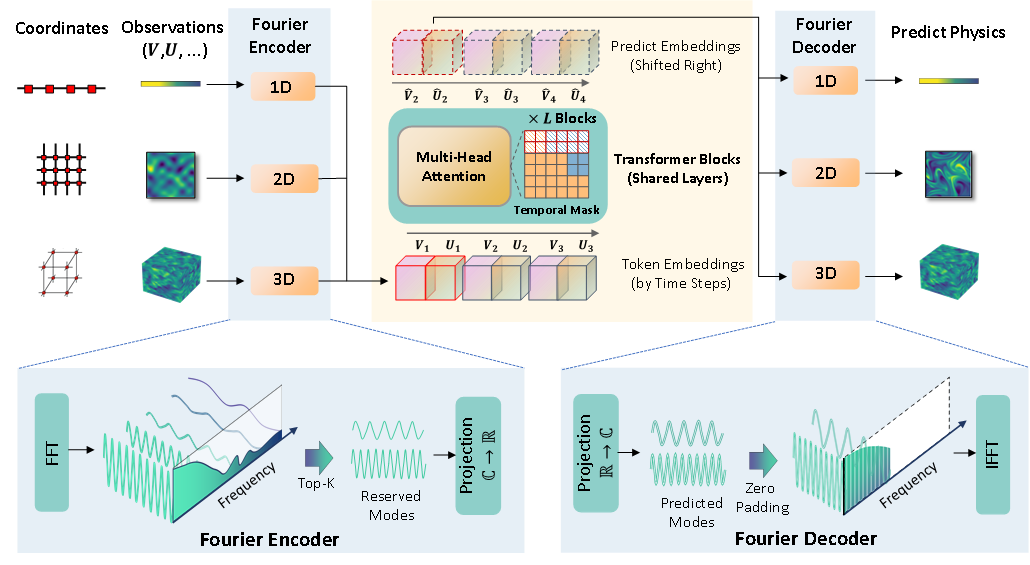 尽管物理数据在欧氏空间维度不同,但在频域空间具有统一的多尺度结构。因此,OmniArch对输入坐标和物理场进行快速傅里叶变换(FFT),保留最重要的Top-K频率分量(模式),从而将不同维度/分辨率的数据被转换为统一长度的频域表示。