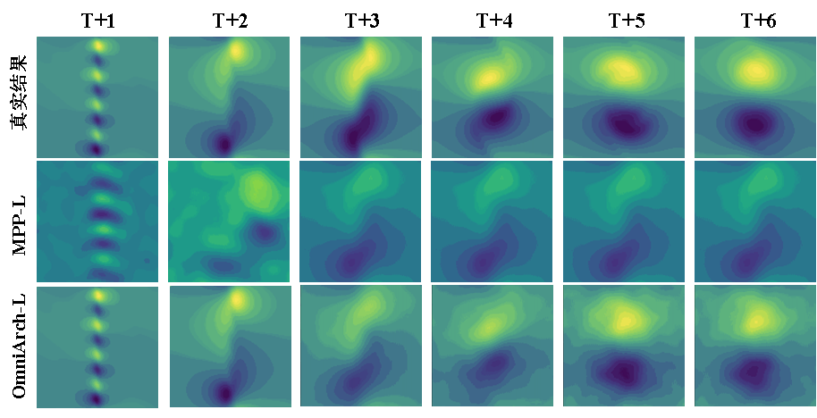 如同大语言模型(LLM)通过提示(Prompt)理解新任务,经过预训练的OmniArch展现出了上下文学习能力。给定少量历史时间步的观测数据(称为“PDE Prompt”),模型即可动态学习并模拟出该特定PDE的算子。