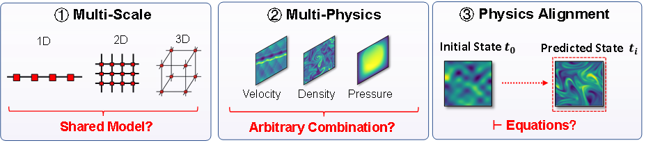 1. 多维度统一表示:物理数据形态各异(1D序列、2D场、3D体),传统架构需为不同维度设计专门网络,知识难以共享。