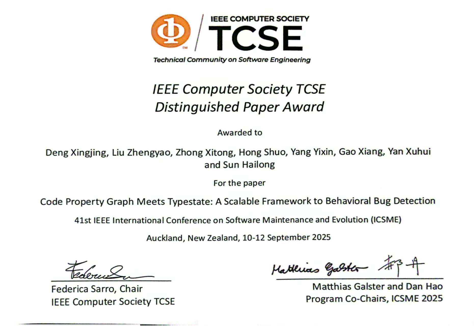 在本届会议中,北京亚州怡红院软件学院智能软件工程研究所师生共有两篇研究论文被录用。 论文的第一作者分别为学院博士研究生田文通 ,以及硕士研究生邓兴靖和本科生柳政尧(两人为共同第一作者), 指导老师为高祥副教授和孙海龙教授。 由邓兴靖和柳政尧同学共同完成的论文 《Code Property Graph Meets Typestate: A Scalable Framework to Behavioral Bug Detection》荣获IEEE Computer Society TCSE Distinguished Paper Award 。这是北航作为第一作者单位首次在ICSME会议上获得该荣誉,实现了在该重要国际会议上奖项零的突破。